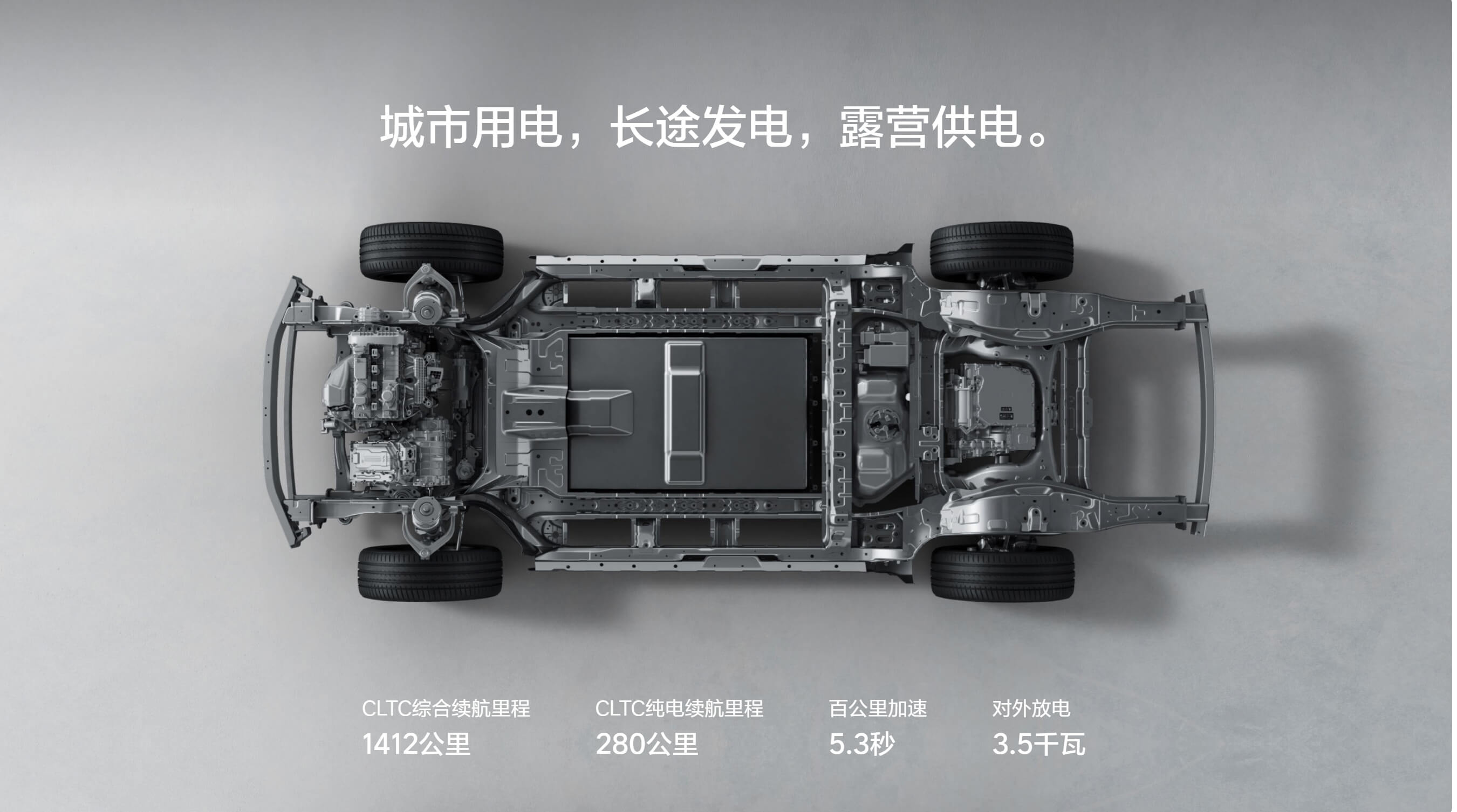 3、CLTC comprehensive range of 1412KM + (pure electric range of 280KM), 100km acceleration 5.3S